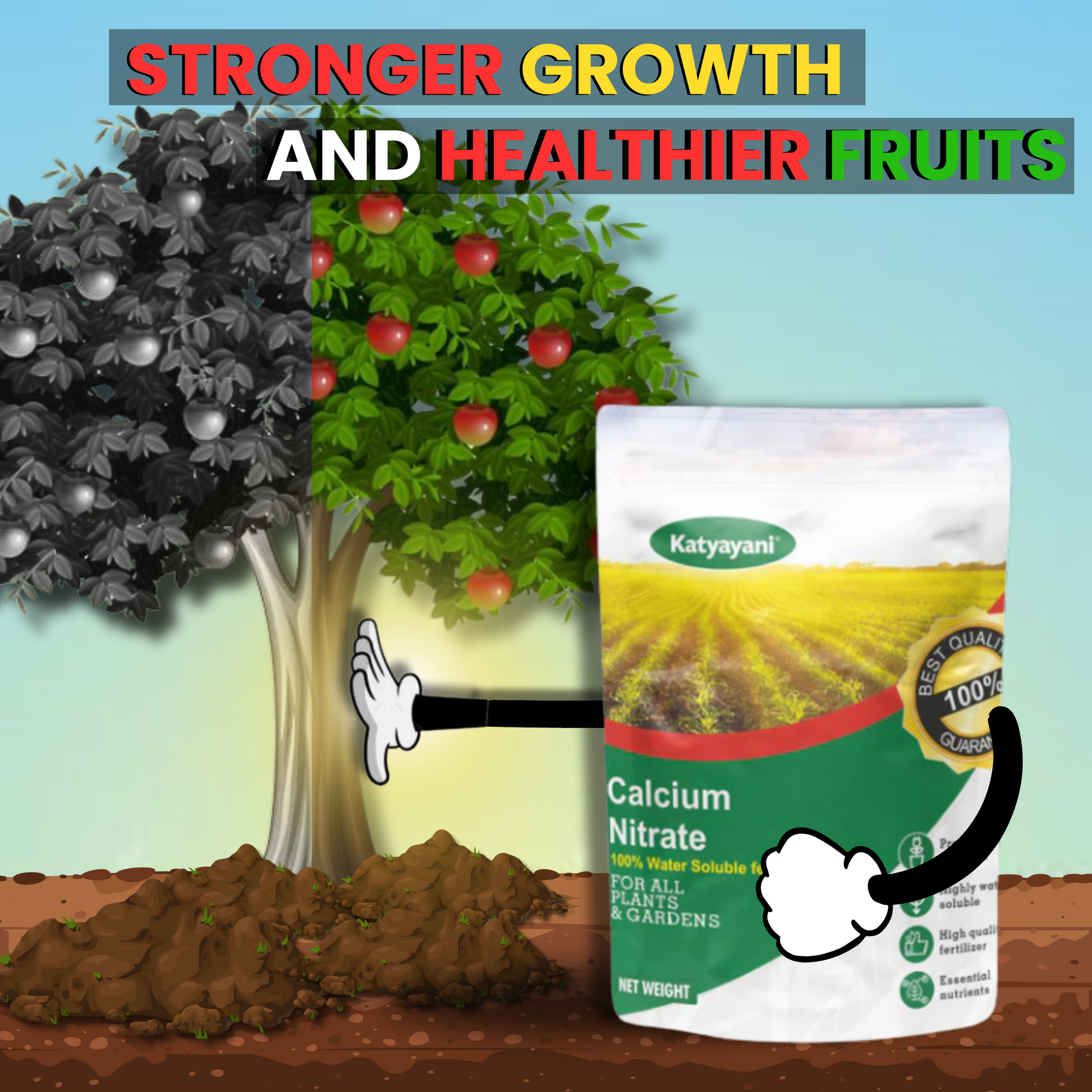 Katyayani Calcium Nitrate is a high-quality, water-soluble fertilizer containing 18.8% calcium and 15.5% nitrogen. It corrects calcium deficiencies, strengthens plant cell walls, and enhances fruit setting while preventing issues like blossom end rot, bitter pit, and fruit cracking. This formulation promotes better plant health, improved nutrient uptake, and higher crop yield with extended shelf life.