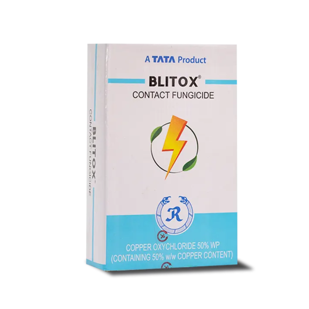 - Mode of Action: Blitox, with its active ingredient Copper Oxychloride, serves as a protective fungicide that operates through both contact and preventive mechanisms. Its efficacy is derived from the direct interaction with fungal spores, during which the copper ions are assimilated passively during spore germination. The absorbed copper then interferes with the pathogens’ enzymatic processes, leading to their elimination. Then, it stops the fungus from growing. Consequently, Blitox is utilized to combat a wide spectrum of fungal and bacterial afflictions in many crops.